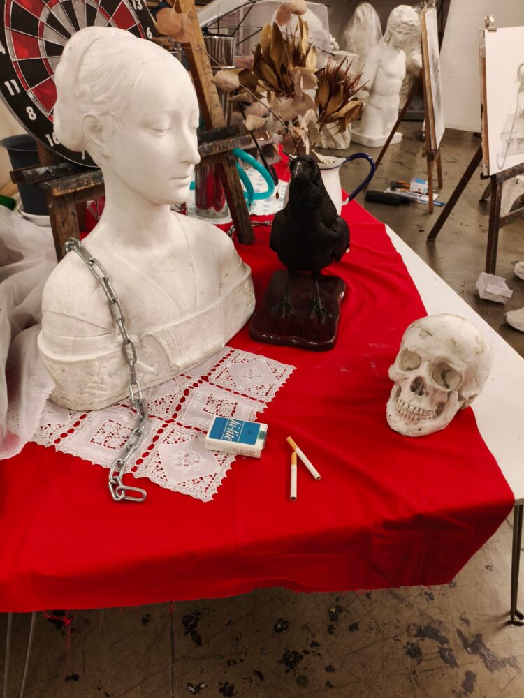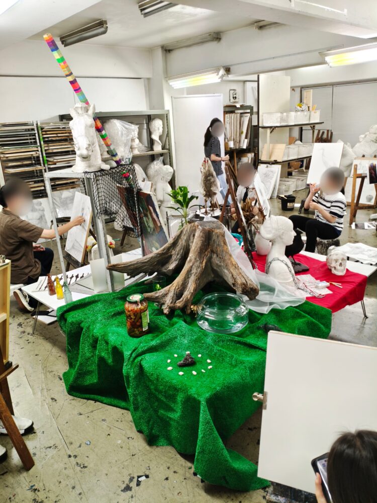 立美祭では生徒が自由に制作した作品を展示をしますが、今年度はアトリエ中央に大きな静物が組まれています。それぞれが興味を持った題材で制作に挑みました。