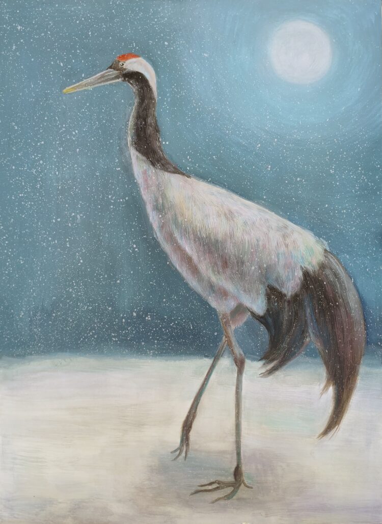 雪原に佇むタンチョウを描きました。静粛な美しさがよく表現されています。水彩絵具の研究を並行して行い、しっかりと向き合った制作ができました。