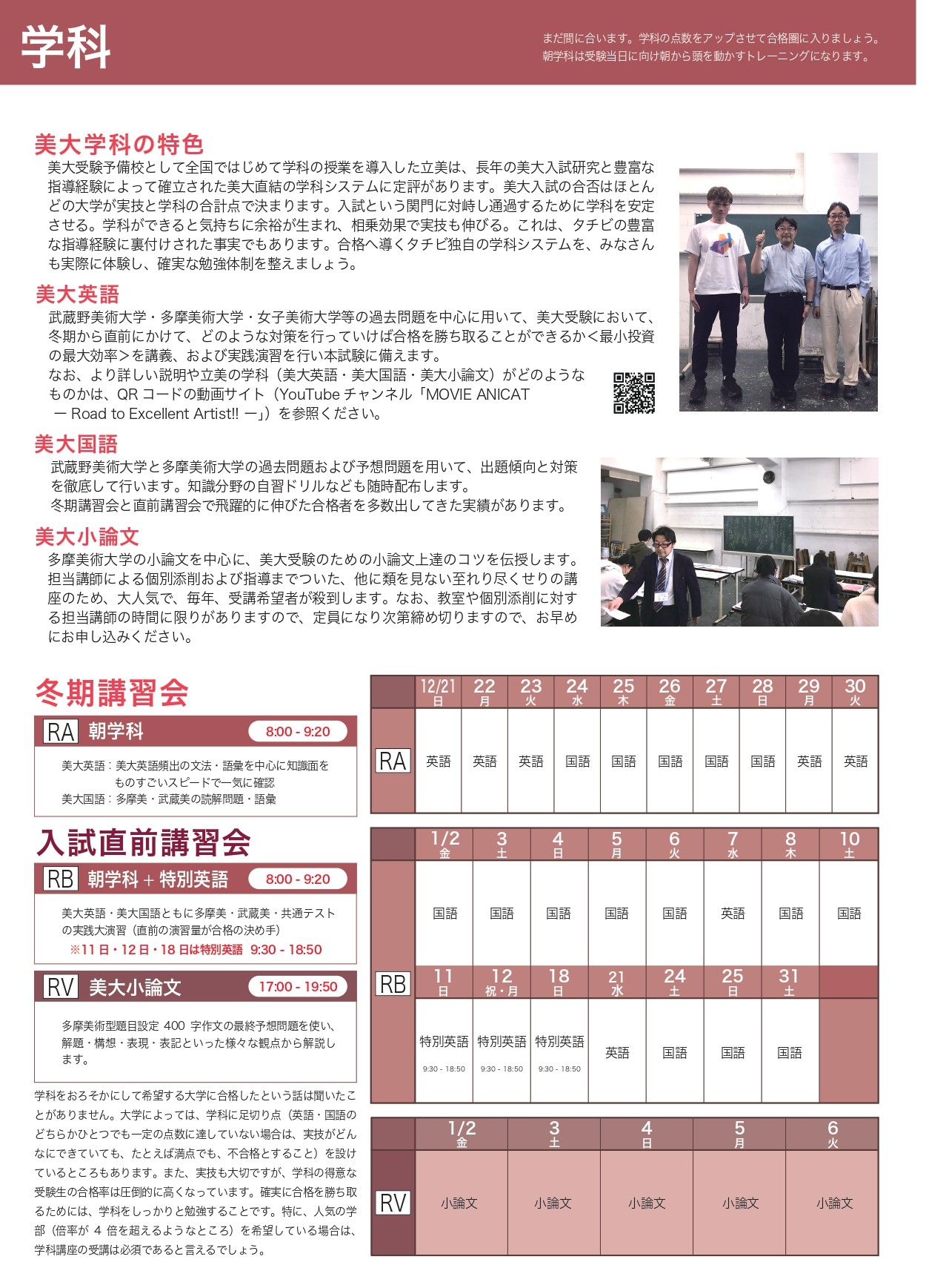 中学レベルの英語の基礎を固めていく基礎英語講座と合格に必要な知識と実践演習を行う美大英語研究講座がセットになっています。特に、美大英語研究講座では、10年以上の歳月をかけて研究し作成した美大英語(武蔵美・多摩美・女子美術大学等)のみに特化したオリジナルテキスト及びプリントを用います。その内容は、美大合格に必要な最小限のことのみに絞り込んだ他に類を見ない良質なものです。通常の受験生が習得すべき英語内容を長年の研究により、5分の1以下にして、美大受験生の負担を減らし、少ない時間で合格できるように工夫されています。また、量を減らすと不安があるかも知れませんが、5分の1以下に減らしたにも関わらず、毎年の的中率は驚異的で、前人未到の領域に達しています。「最小投資の最大効率」をまさに実現化している講座で、美大英語講座日本一を自負しています。また演習にも力を入れています。過去問をベースにした予想問題が付随する実践演習です。この実践演習も毎年何問もの的中問題を出しています。
