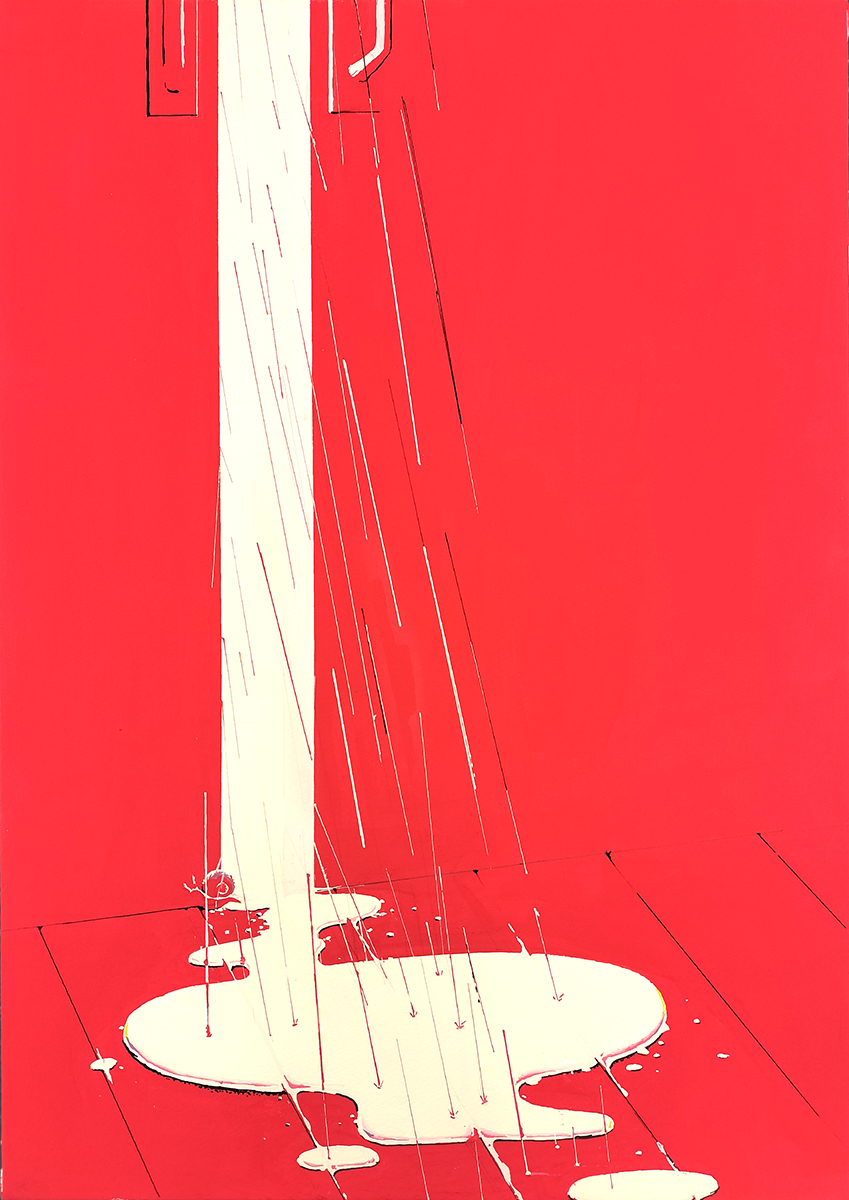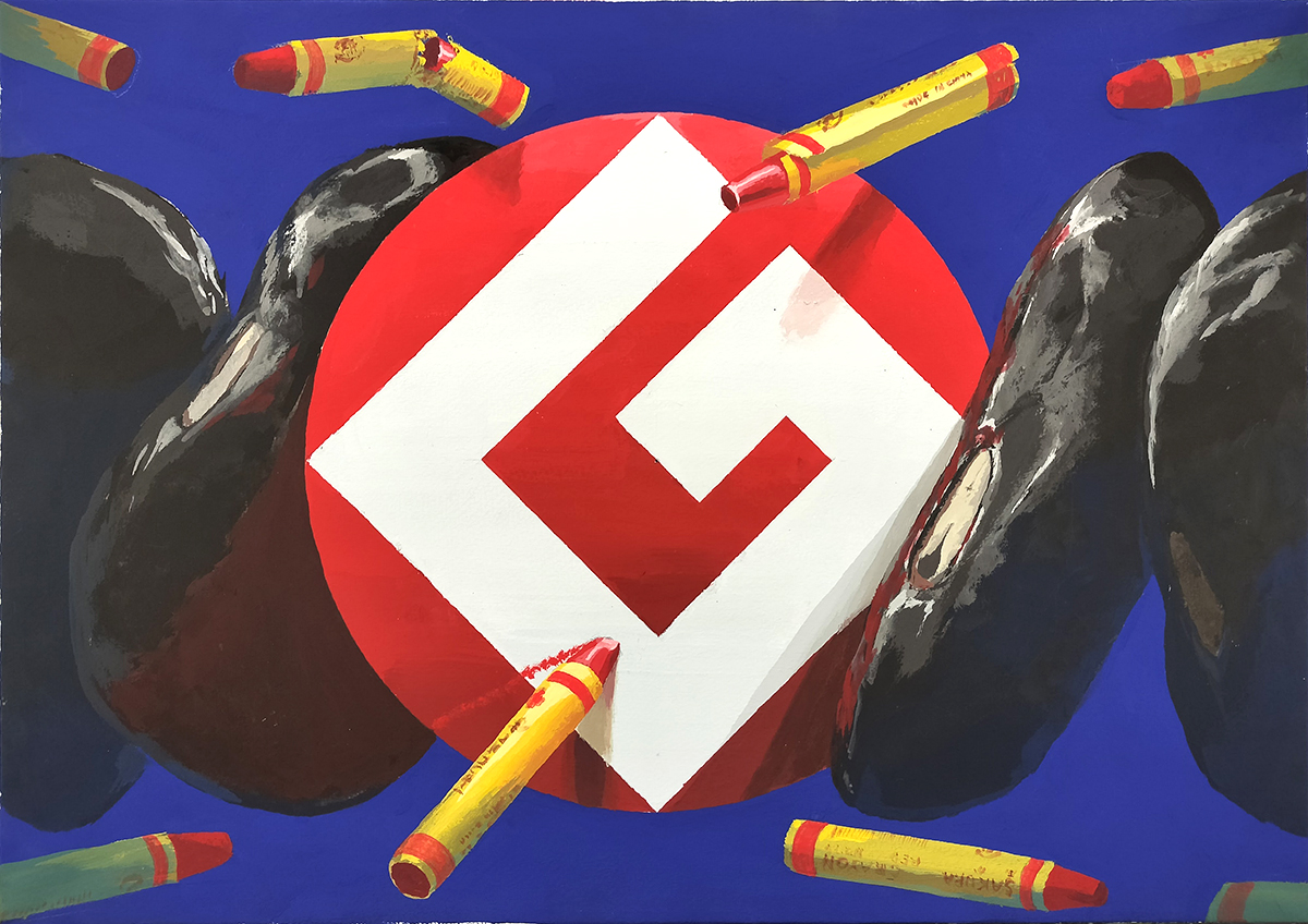 平面構成ではとにかくサイケデリックな色を使って、どんなモチーフも違う色で描いたりしていましたが、ただ見かけが派手なだけで、その色使いが作品の良さに繋がっていませんでした。 なかなか表現方法がまとまらず焦り始めている時、金子先生のある一言で自分の作風に迷いが無くなりました。それは「俺を驚かせてほしい」という言葉でした。それからは毎課題、その言葉を意識して作品を作っていましたが、今思い返すと、見た人を驚かせることは受験だけでなく、大学や仕事での作品作りにも通ずることだと思います。驚きにもインパクトへの驚き、繊細さへの驚きなど色々ありますが、見た人がびっくりする「やり切り感」が大切なのだと思います。